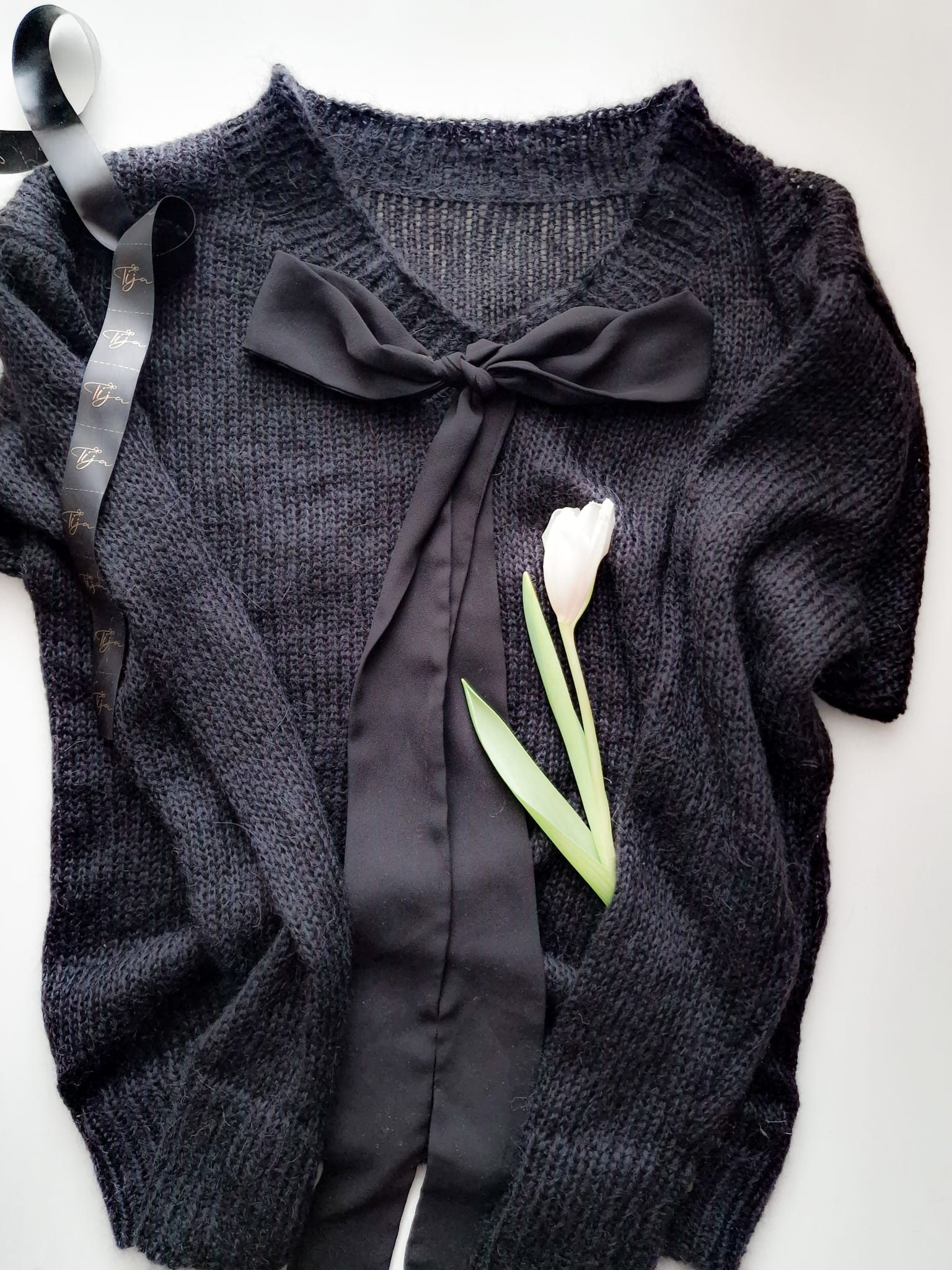 Elegants un romantisks, klasiska stila džemperis ar V veida kakla izgriezumu un dekoratīvu lenti. Lente melnā krāsā neatkarīgi no džempera krāsas, kā unikāls akcents klasika, siluetam.