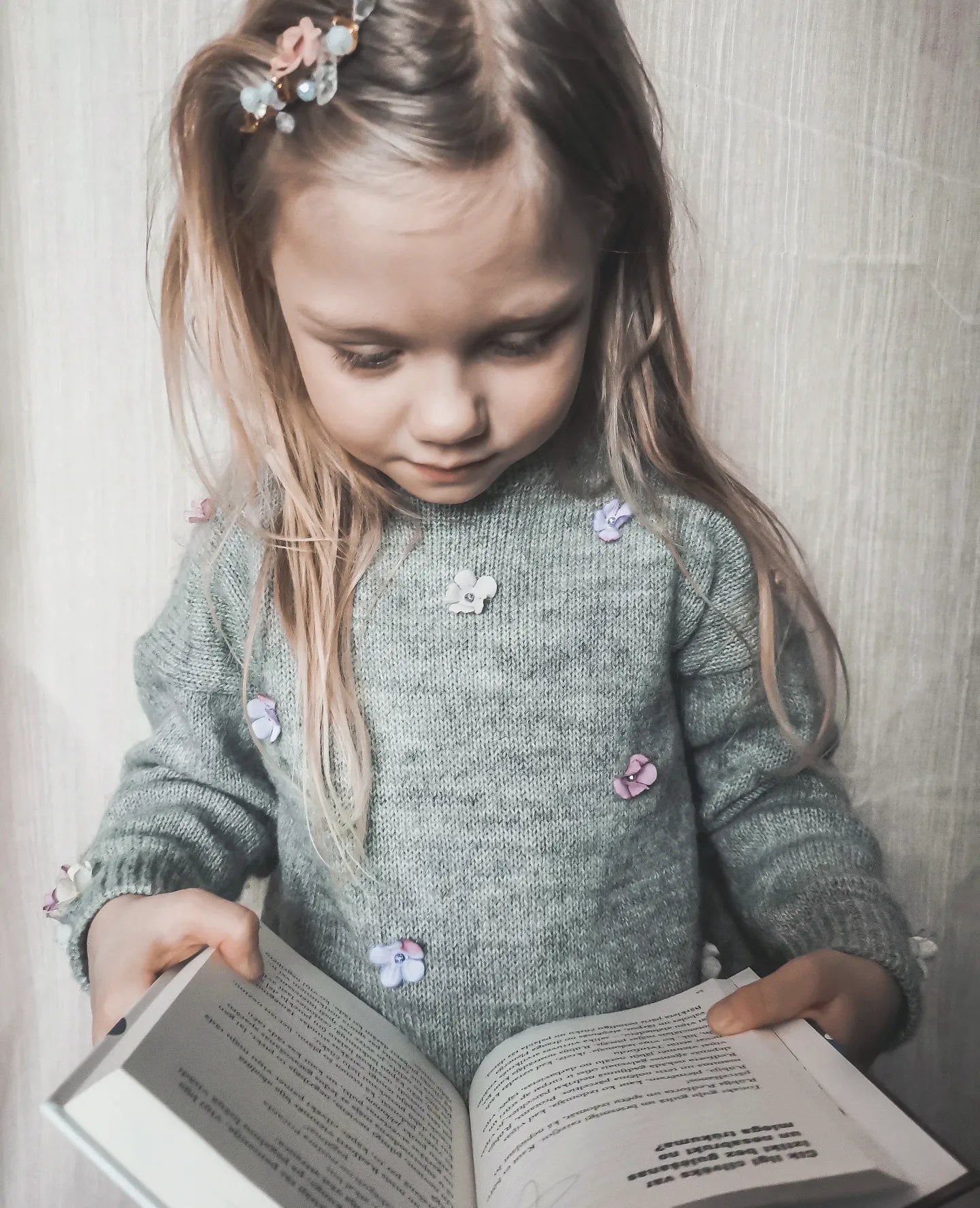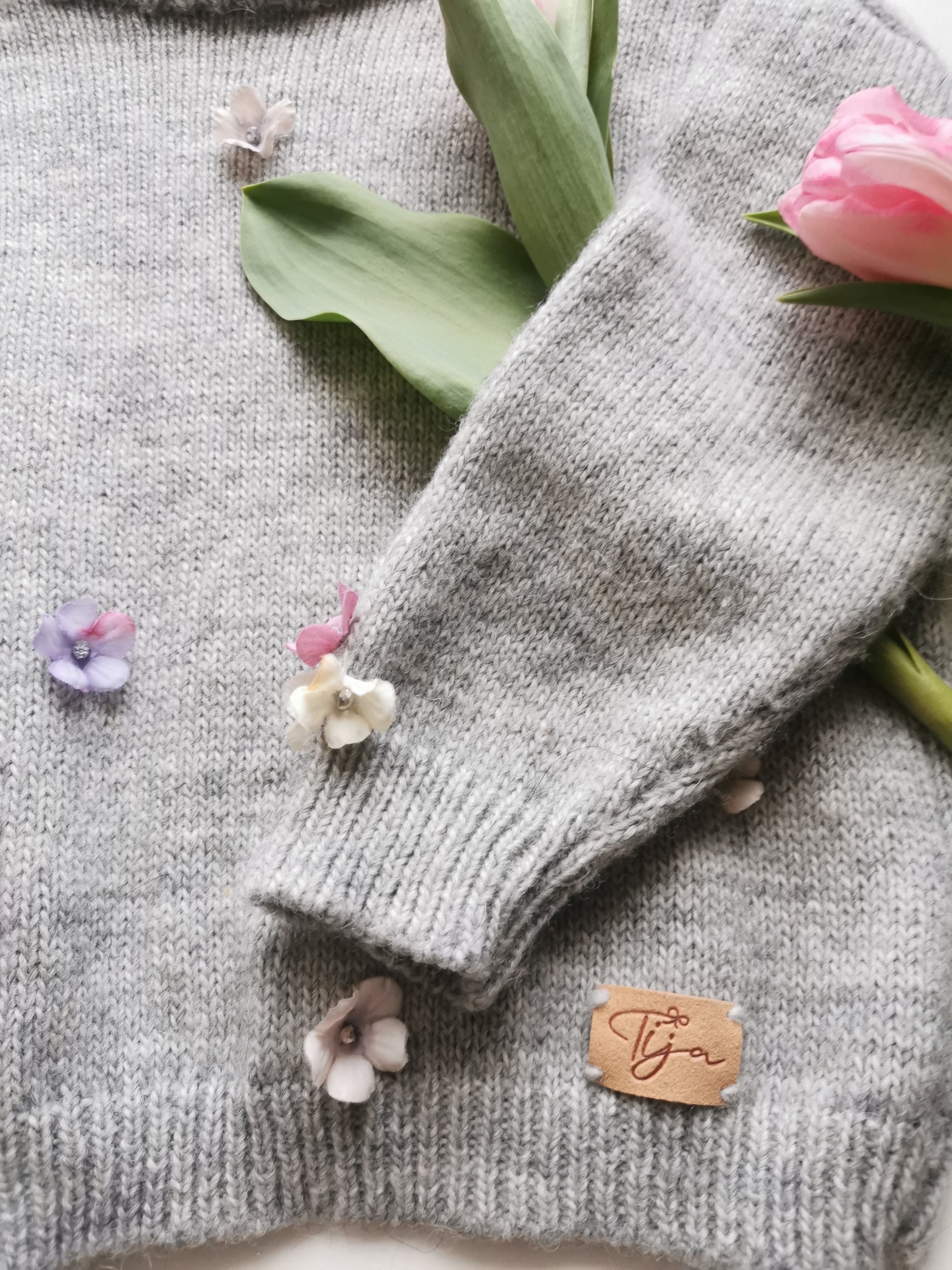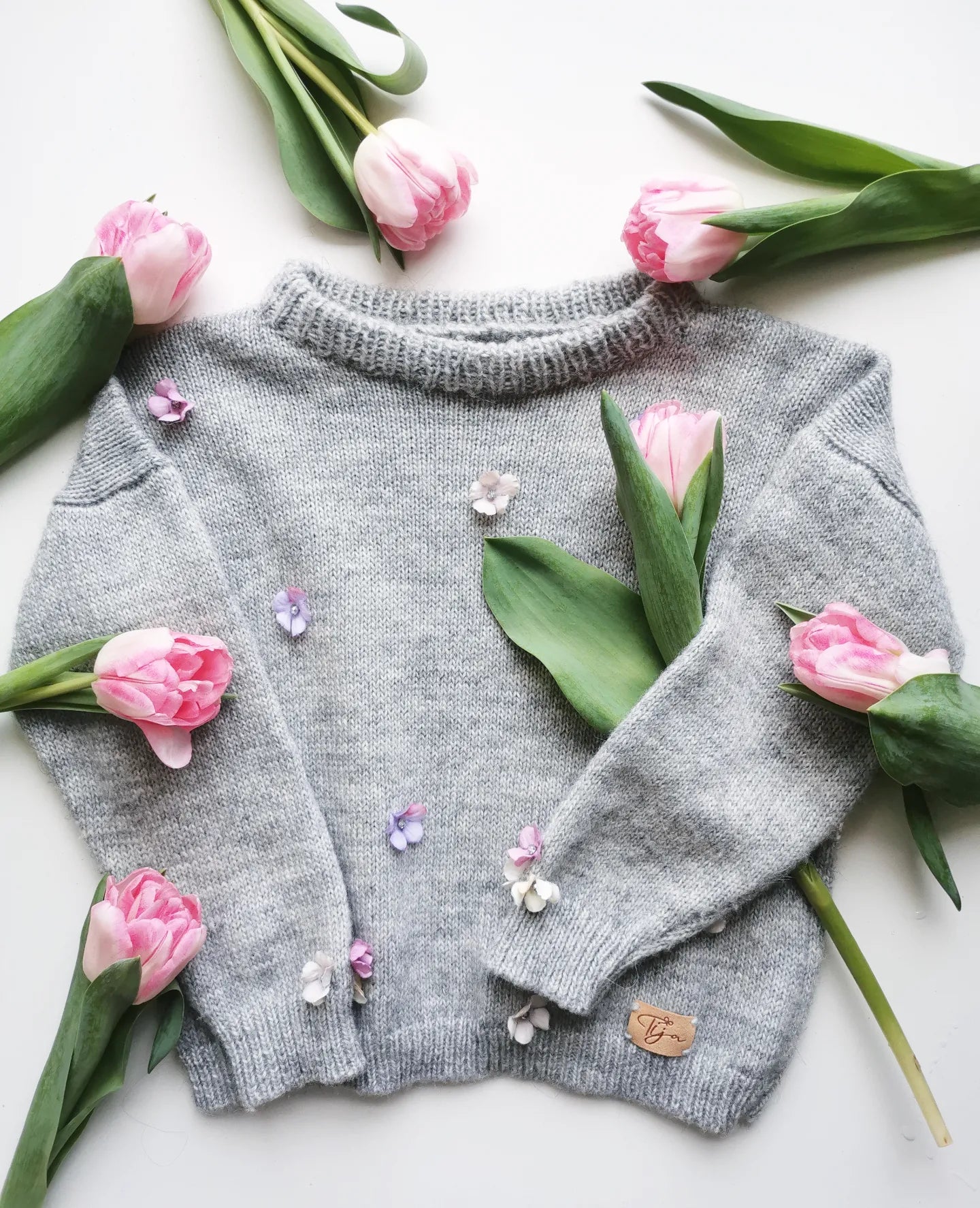 Mīksts džemperis no smalkas merino dzijas ar uzšūtem ziediņiem un pērlītēm.