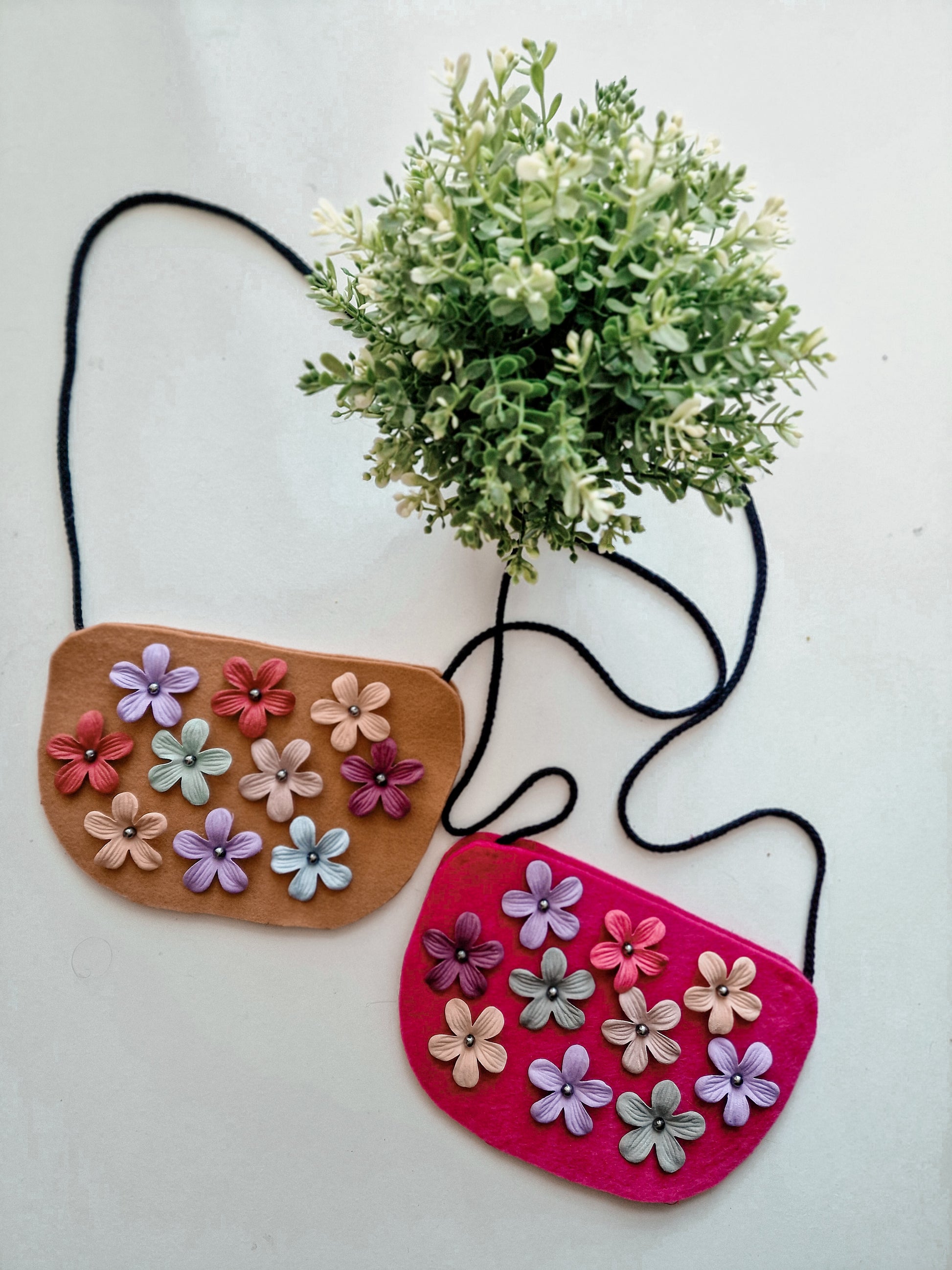 Soma darināta no filca. Virspusē uzšūti ziedi ar pērlītēm.