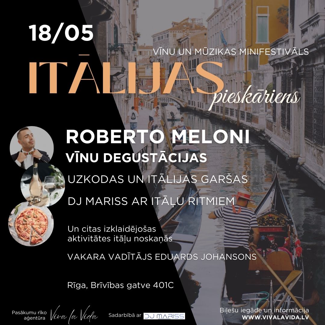 Iedomājies sevi skaistā 18.maija vakarā, paceļot vīna glāzi, vērojot priekšnesumus un baudot Itālijas atmosfēru tepat Latvijā! Festivālā uzstāsies vislatviskākas itālis Roberto Meloni, itāļu dejas ritmos Jūs ievirzīs "Zumba Dance Family". Par vakara atmosfēru rūpēsies Valmieras drāmas teātra aktieris Eduards Johansons. Itāļu mūzika un dejas kopā ar DJ Mariss.