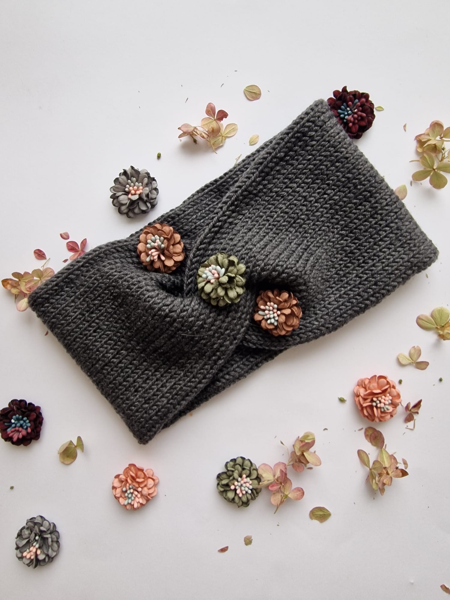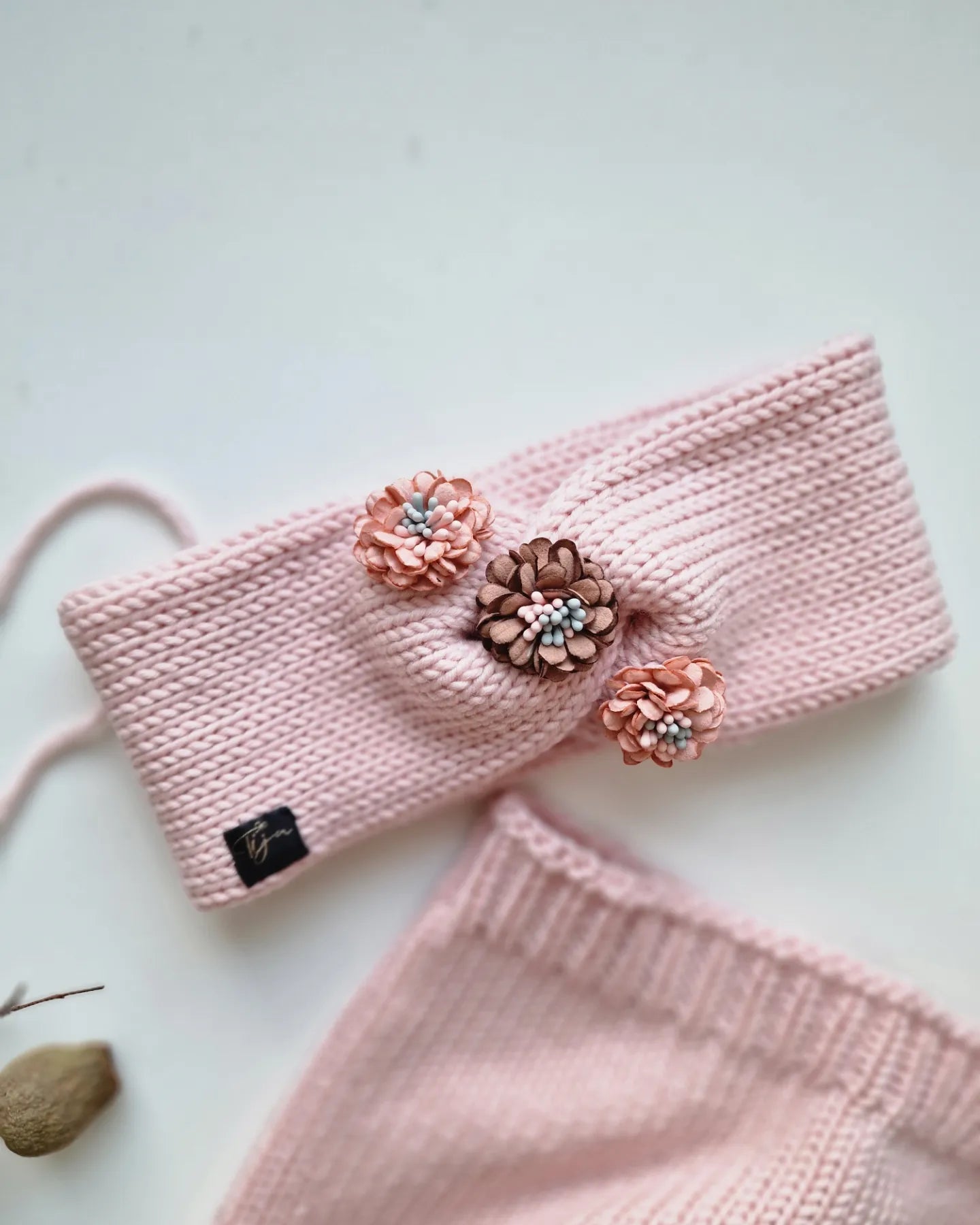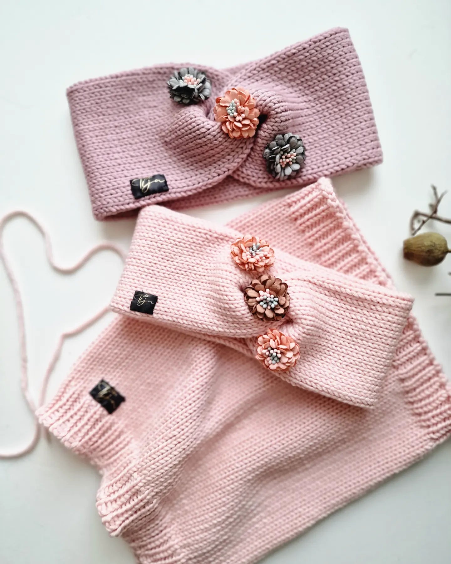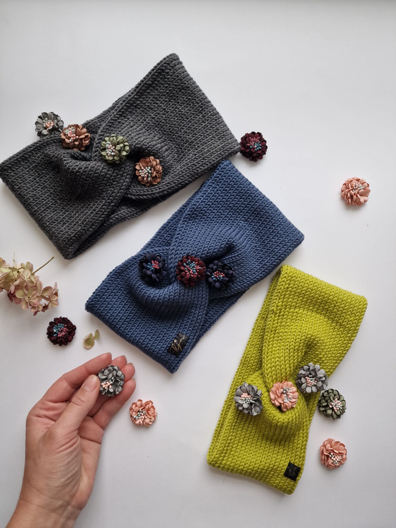 Merino dzijas pieaugušo un bērnu ausaines ar ziediņu dekorāciju.