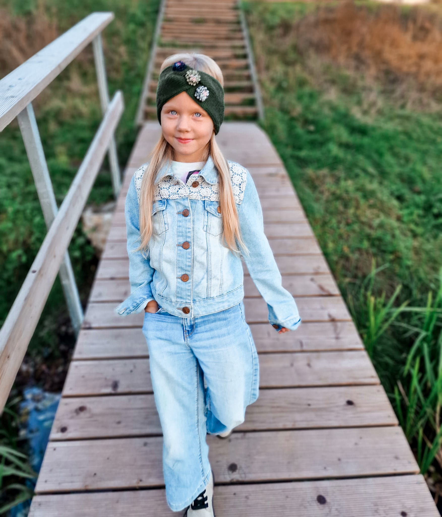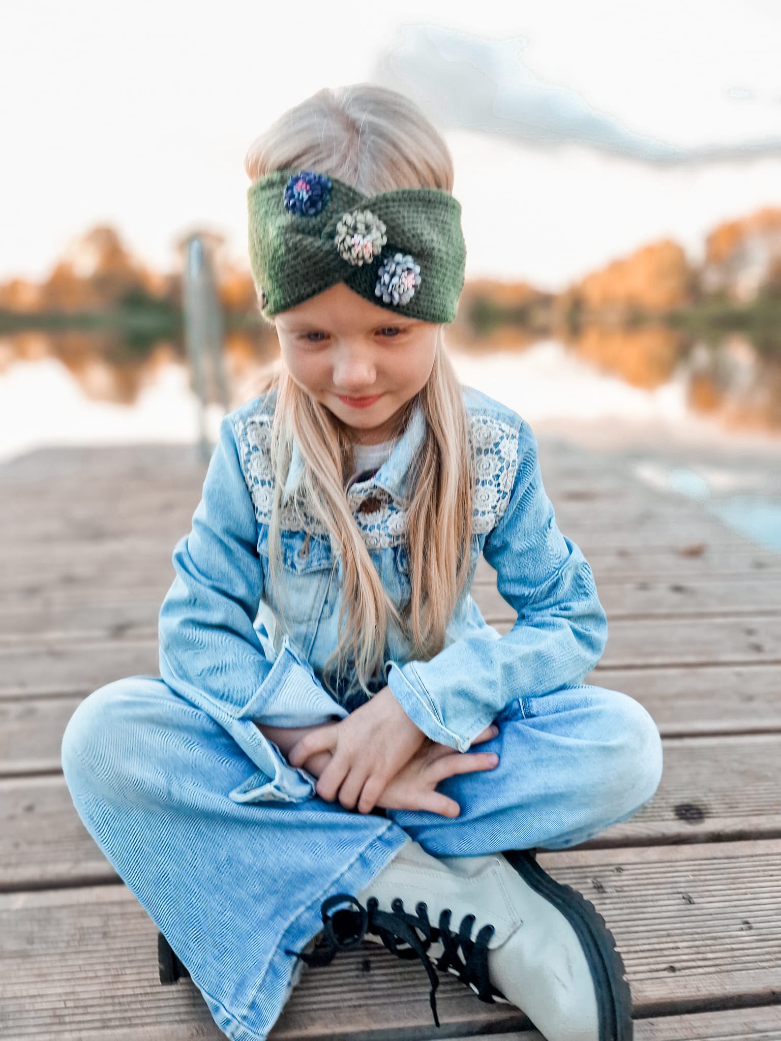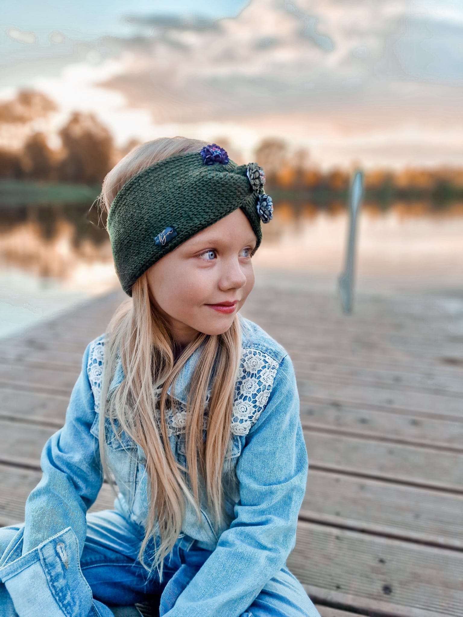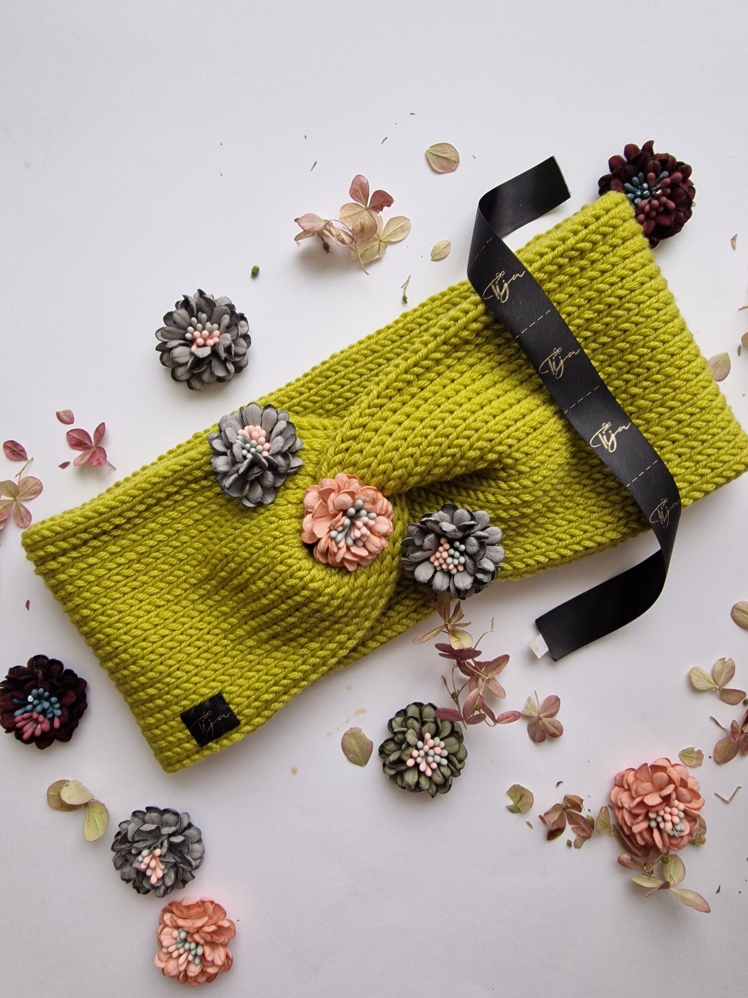 Merino dzijas pieaugušo un bērnu ausaines ar ziediņu dekorāciju.