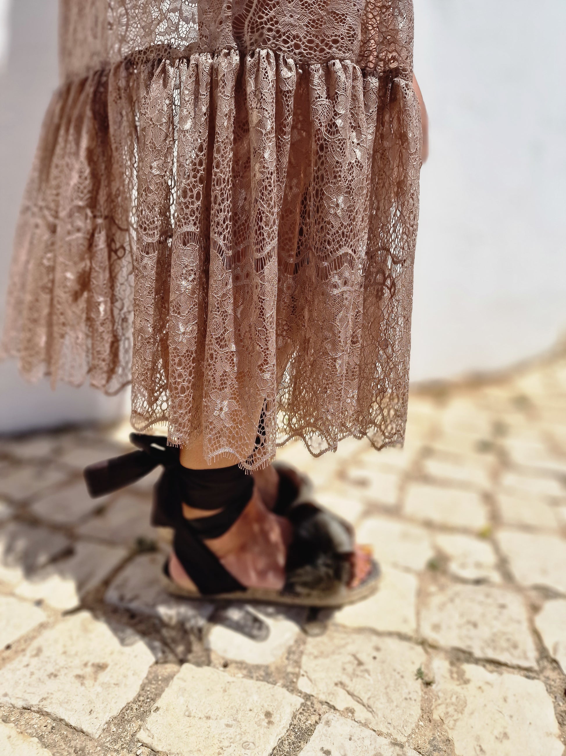 Grezns kimono tipa halāts no mīksta mežģīņu auduma.