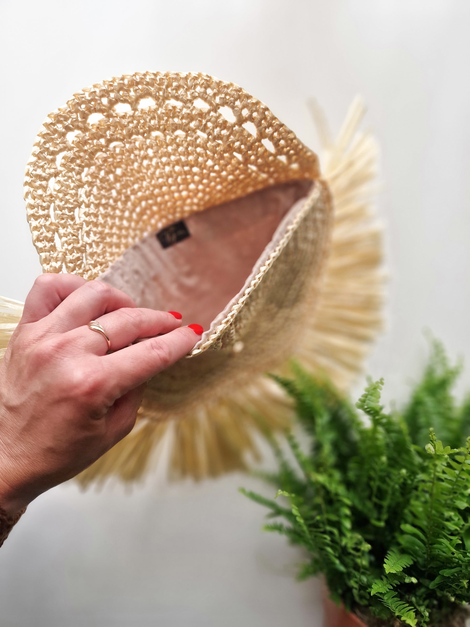 Raffija ir palmu šķiedra. Viegla, gaisīga un ekoloģiska. Piemērota vegāniem.