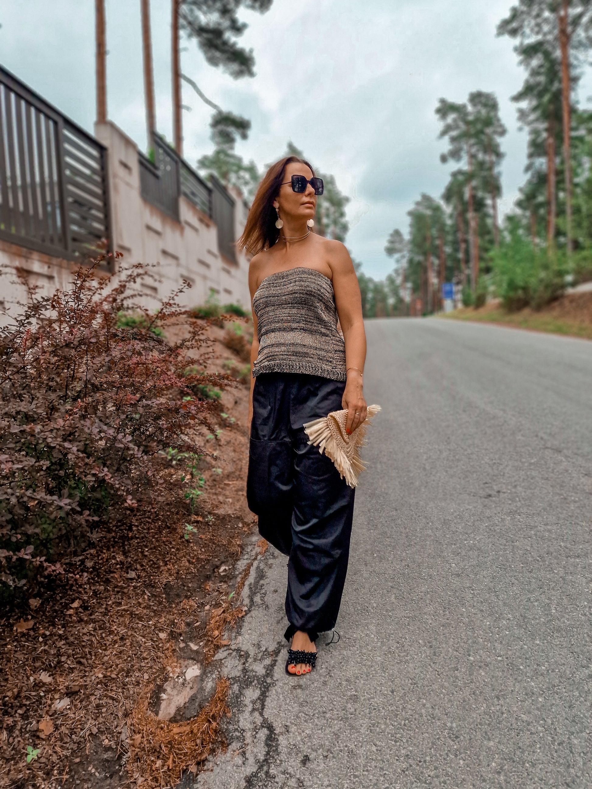 Augšpuses daļa nostiprināta ar gumiju. Kombinē ar svārkiem, biksēm, šortiem.