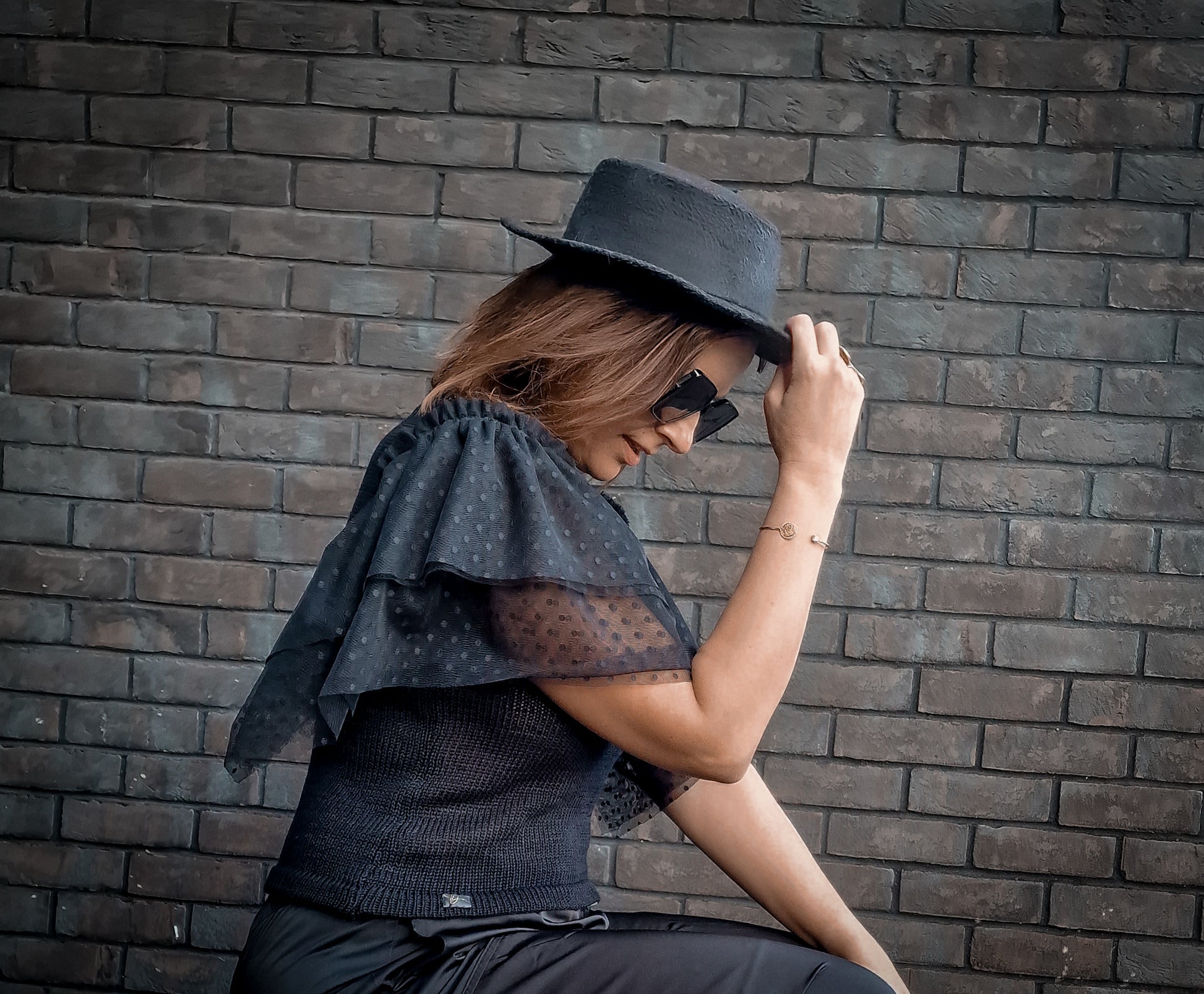 Tops, ar romantiskām, kuplām, sievišķīgām tilla piedurknēm.