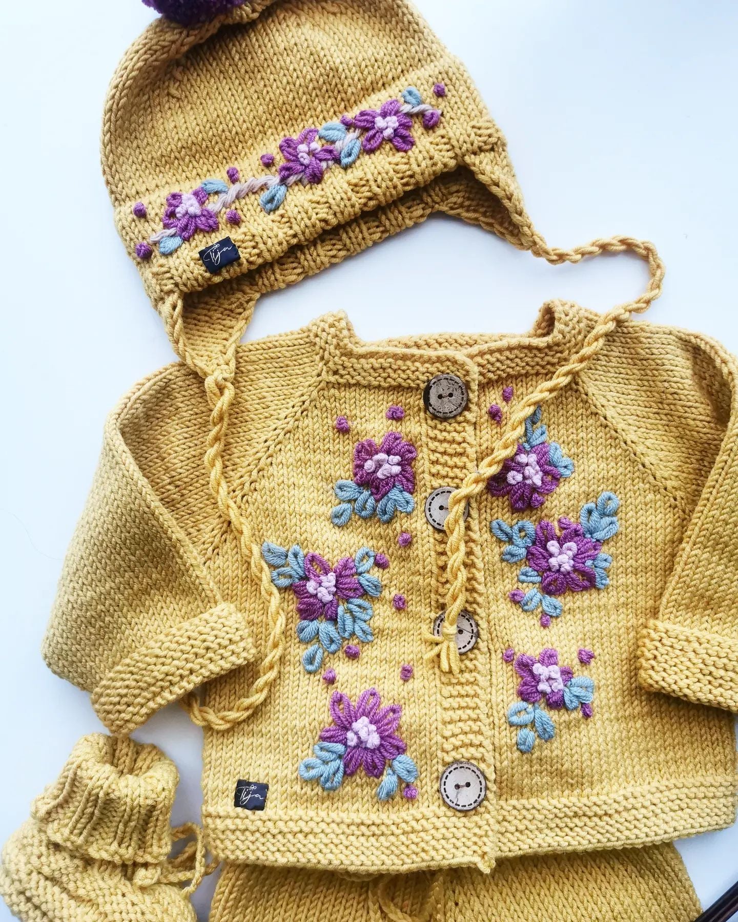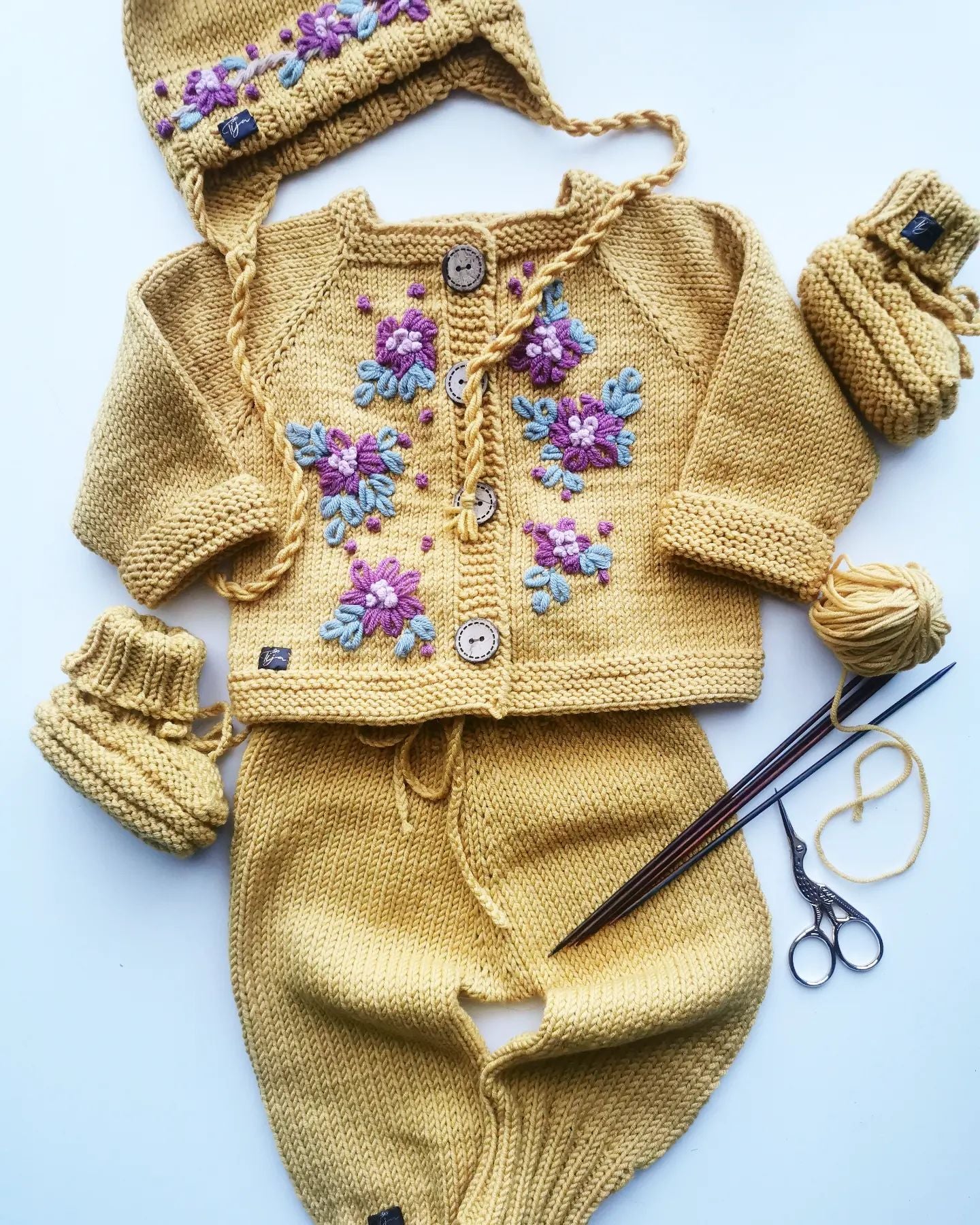 Ar rokām darināts merino vilnas komplekts mazuļiem. Jaciņa, bikses, cepure un zābaciņi. Dekorēts ar ziedu izšuvumu. Lieliski piemērota kā dāvana jaunajiem vecākiem.